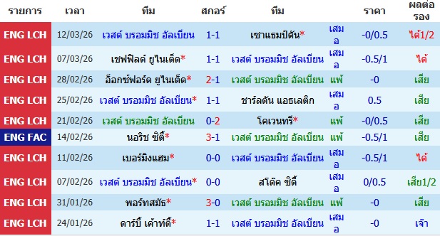 ราคาบอล : เวสต์บรอมวิช ต่อ 0/0.5