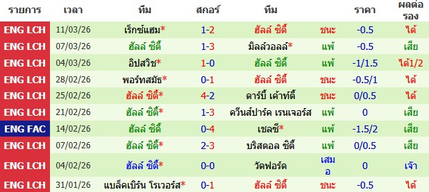 ผลงาน 10 นัดหลังสุดของทีม ฮัลล์ ซิตี้