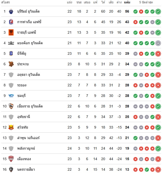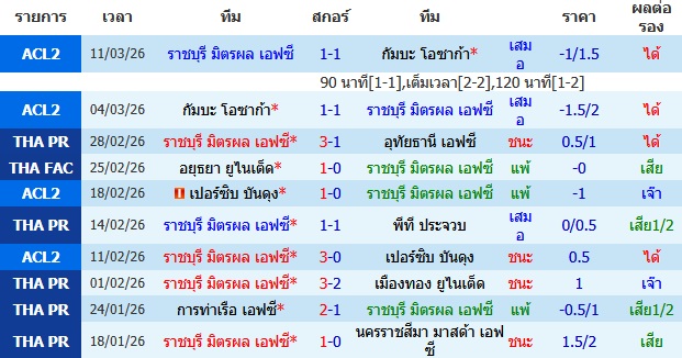 ผลงาน 10 นัดหลังสุดของทีม ราชบุรี มิตรผล เอฟซี