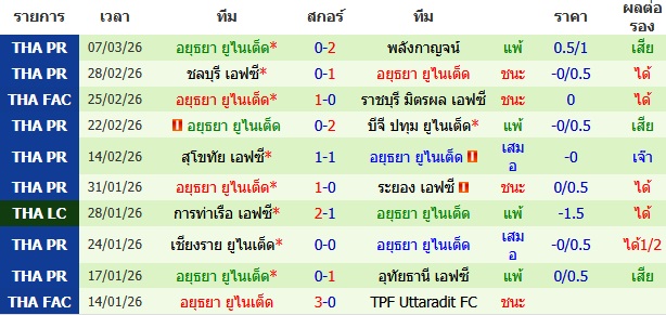 ผลงาน 10 นัดหลังสุดของทีม อยุธยา ยูไนเต็ด