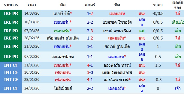ผลงาน 10 นัดหลังสุดของทีม เชลบอร์น