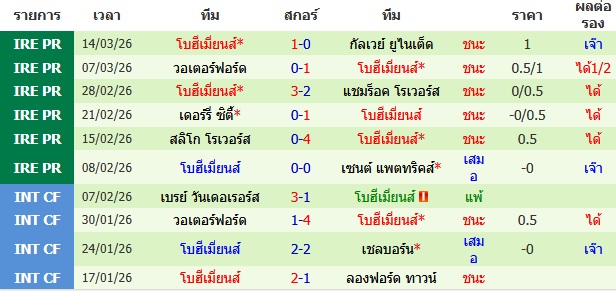 ผลงาน 10 นัดหลังสุดของทีม โบฮีเมี่ยนส์